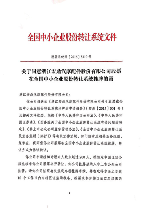 關(guān)于同意浙江宏鼎汽摩配件股份有限公司股票在全國(guó)中小企業(yè)股份轉(zhuǎn)讓系統(tǒng)掛牌的函
